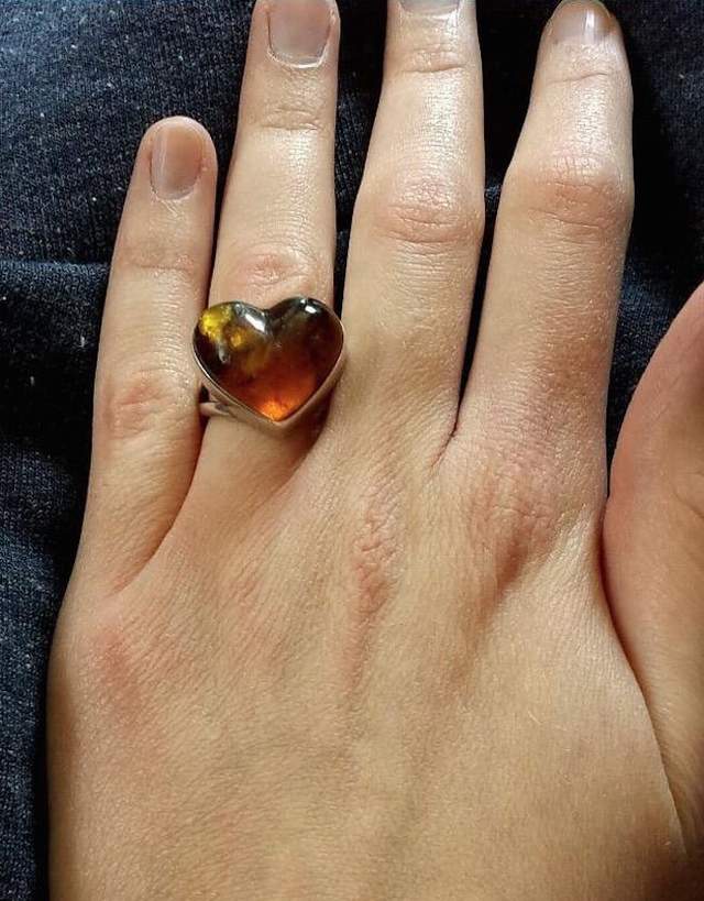 ▼登愣~戒指本人駕到,就是它!女網友表示:「我對這個戒指不滿的點在於 - 1.它又大又俗氣,看起來像是給長輩戴的。2.我最討厭心型的珠寶。3.我喜歡淡色或蜂蜜色的琥珀,但這個顏色太深了。4.要是每天戴著它,一定很快就會充滿刮痕又沒有光澤。」