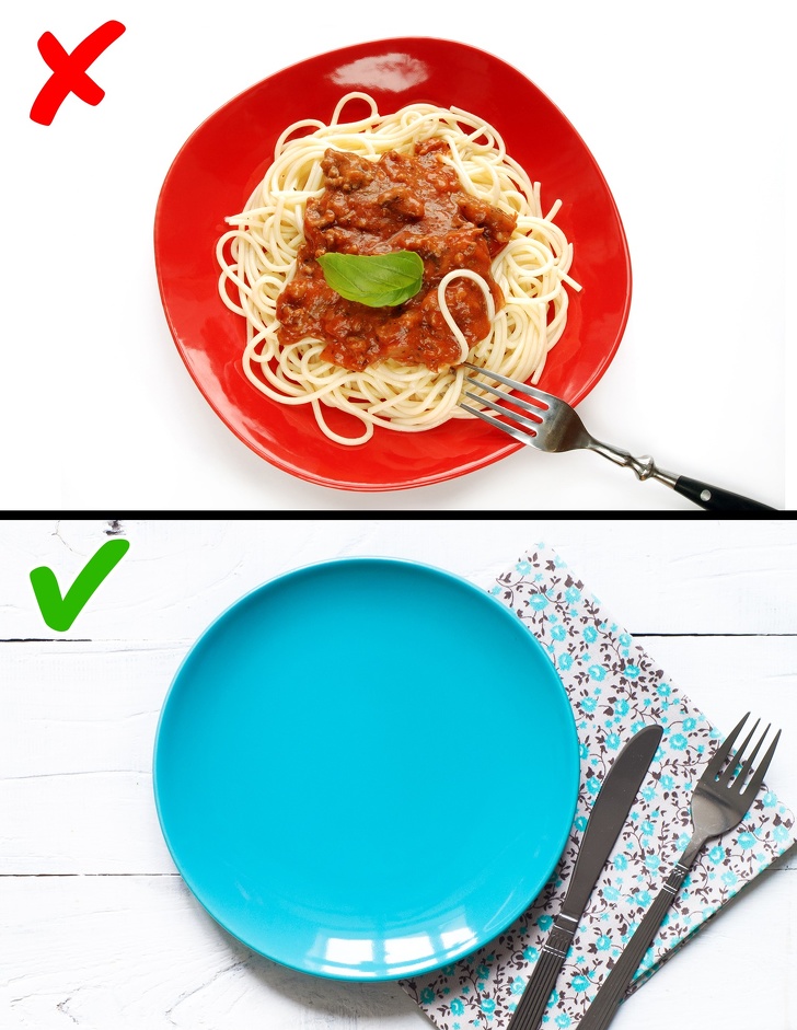 研究發現,在顏色有強烈對比的環境之下,你的食慾會減少很多。例如使用藍色的碗盤裝食物效果最好,牆壁或是擺設品以藍色為主也有同樣的效果。