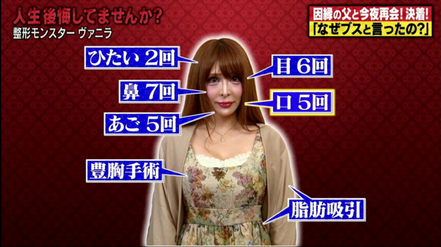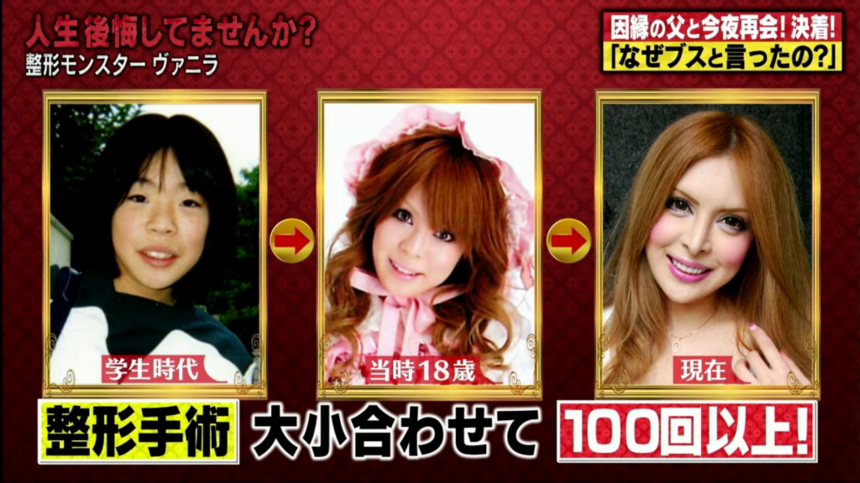 日本女星Vanilla Chamu有「日本史上最強整形怪獸」之稱,為了把自己變成精緻的法國娃娃,她從高中時就開始整形,2013年時登上電視節目爆紅。近幾年來Vanilla很少在電視中出現,2018年末有網友發現她轉戰Youtube,崩壞的容貌在2ch論壇上引發熱議。