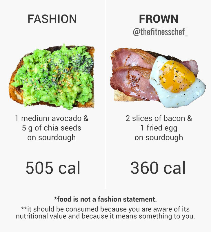 ▼1.酪梨與奇亞籽麵包:505大卡;培根煎蛋麵包:360大卡。很多人覺得前者比後者更高級、更時尚,但食物跟時尚無關,我們應該關注的是營養價值和身體需求。