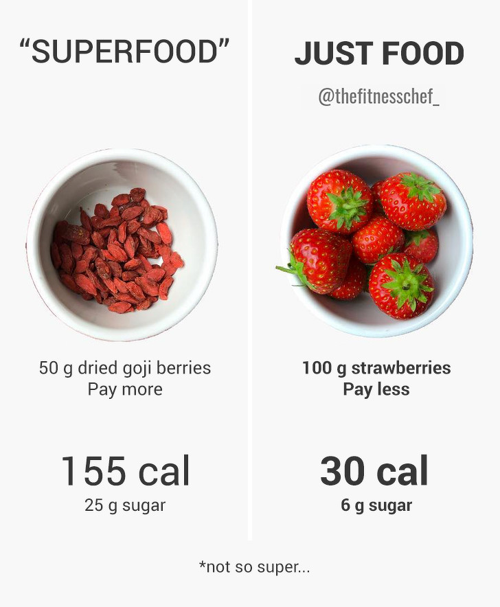 ▼6.酪梨、枸杞、苦茶油…這些都是很夯的「超級食物」,人們認為這些食物有益健康又有高營養價值。但對比「超級食物」枸杞和「普通食物」草莓,前者價格高、熱量高、含糖量高,好像也沒有多「超級」…