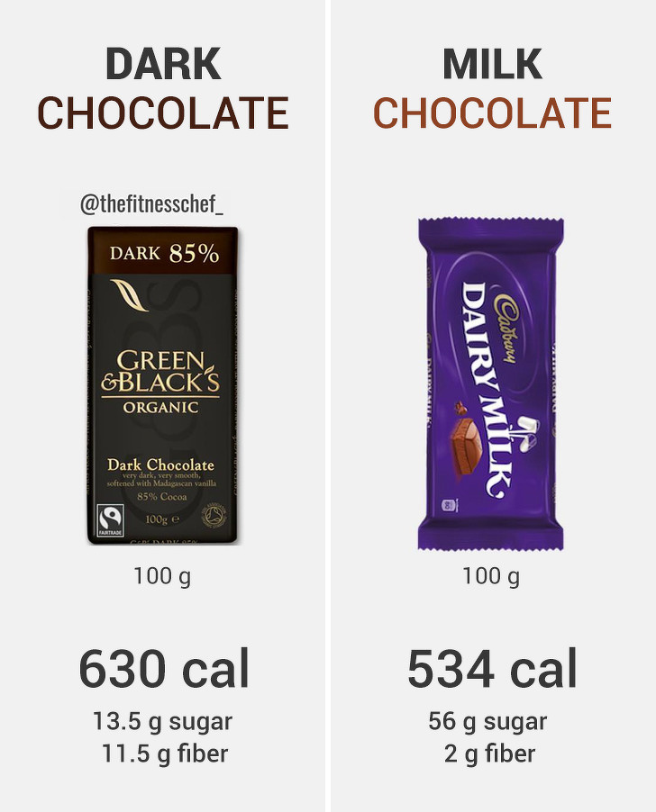 ▼20.100g黑巧克力:630大卡,含有13.5g糖、11.5g纖維;牛奶巧克力:534大卡,含有56g糖、2g纖維。
