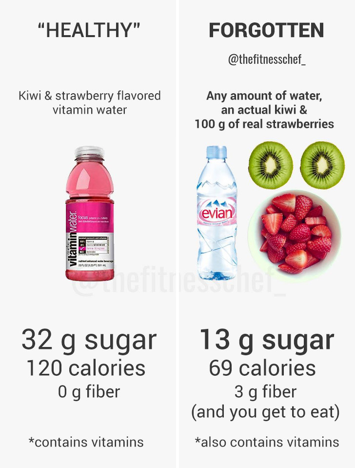 ▼13.傳說中的「健康飲料」維他命水:32g糖、120大卡、0纖維;真正健康的食物礦泉水和水果:13g糖、69大卡、3g纖維。