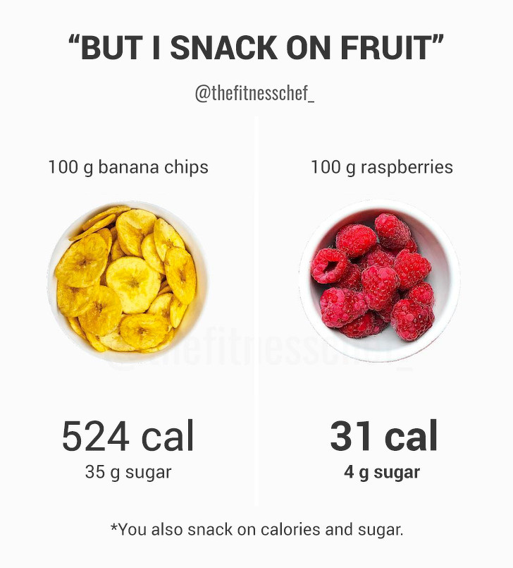 ▼10.100g香蕉脆片:524大卡,35g糖;100g覆盆子:31大卡,4g糖。水果做的零食可不像水果那麼健康。