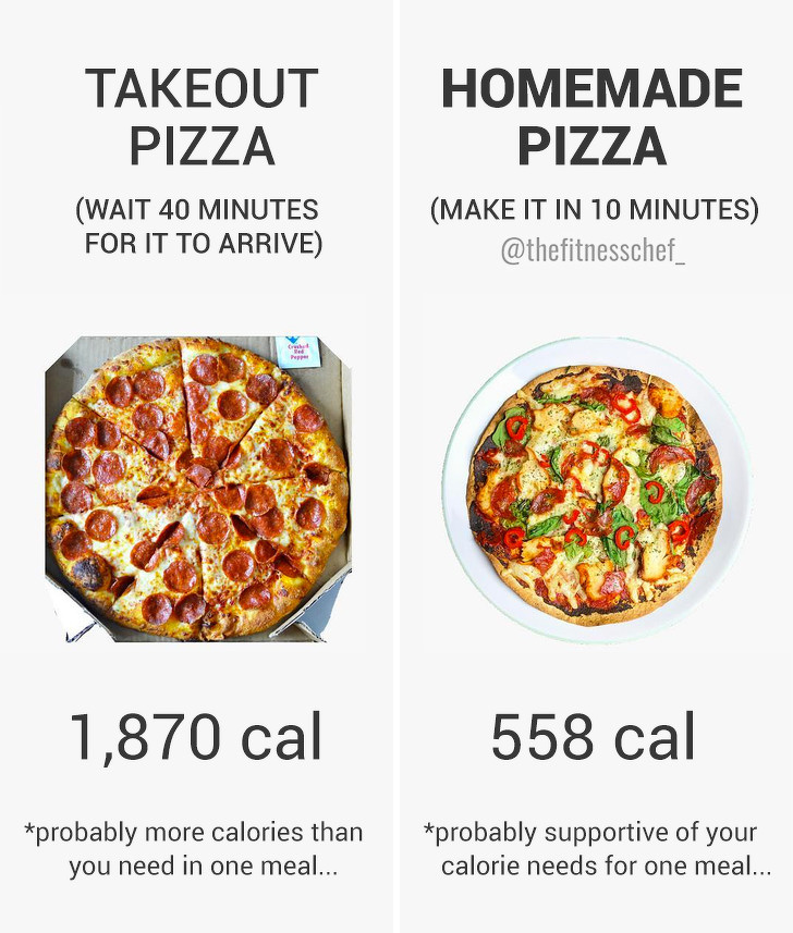 ▼18.花40分鐘等外送披薩,結果攝入1870大卡;自己花10分鐘做披薩,只要558大卡。