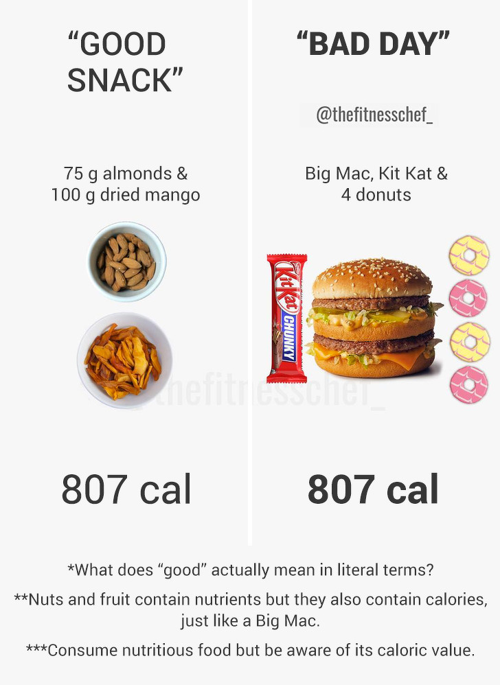 ▼9.杏仁與水果乾:807大卡;漢堡和奇巧巧克力:807大卡。兩者熱量相同,但所有人都知道前者更健康,因為杏仁與水果乾營養豐富。如果大吃特吃杏仁與水果乾,也會發胖。大家吃「健康食物」的時候也要節制,不要忽略了熱量。