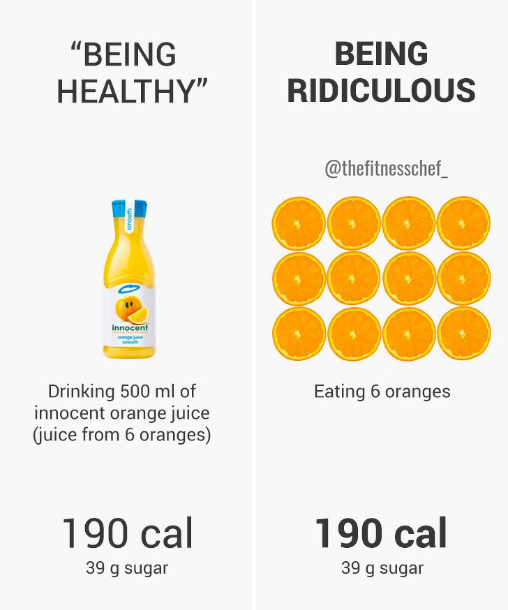 ▼4.有人覺得喝柳橙汁很健康,也很時尚,但直接吃柳丁就很荒唐。但喝500毫升鮮搾柳橙汁與吃6顆柳丁是一樣的。