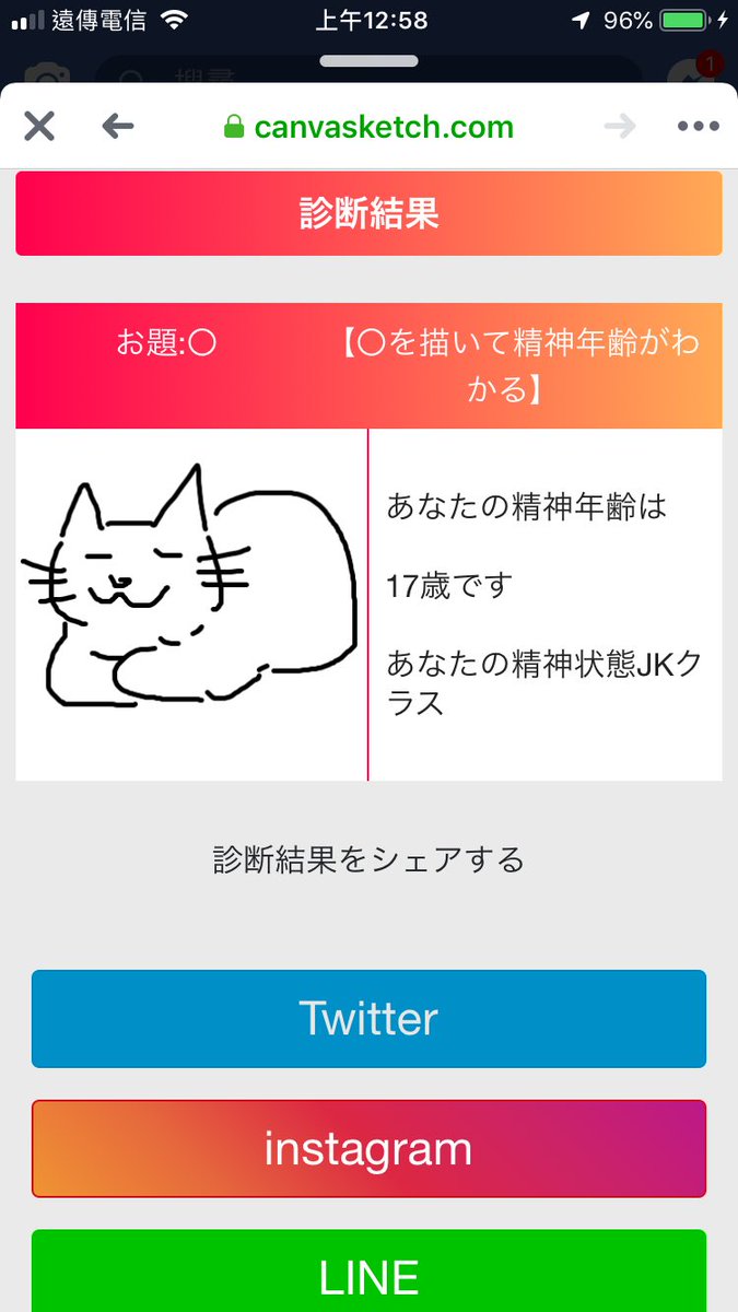 ▼畫好後按下送出,結果就出來啦~測試精神年齡是52歲,屬於初老年齡…