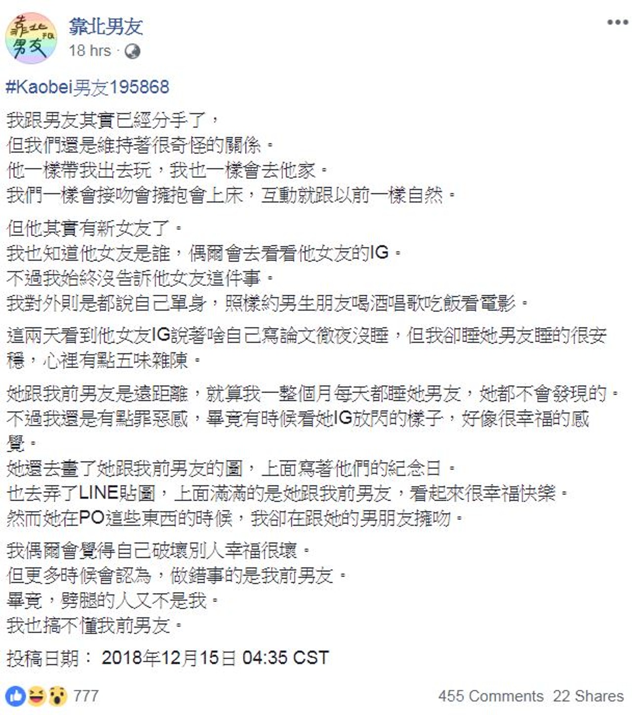 2018年12月21日有人說「分手後不打擾才是最好的溫柔」,但並不是所有人分手後都會這樣做。一名女網友在facebook專頁「靠北男友」發文說,她與男友分手後還像以前一樣相處,兩人會一起出去玩,接吻、擁抱甚至發生關係。這些前男友的新女友都不知道。