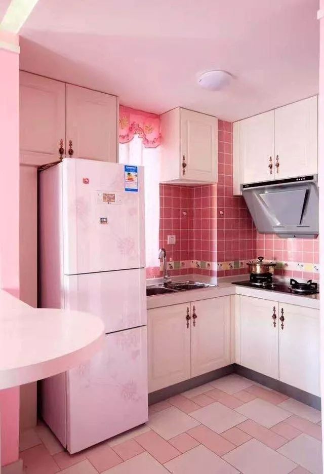 ▼廚房的牆壁採用了粉紅色的方形磚,木櫃則是白色的。一旁的窗戶掛著粉紅色的紗簾,這裡沒有Hello Kitty,卻處處有Hello Kitty的影子。