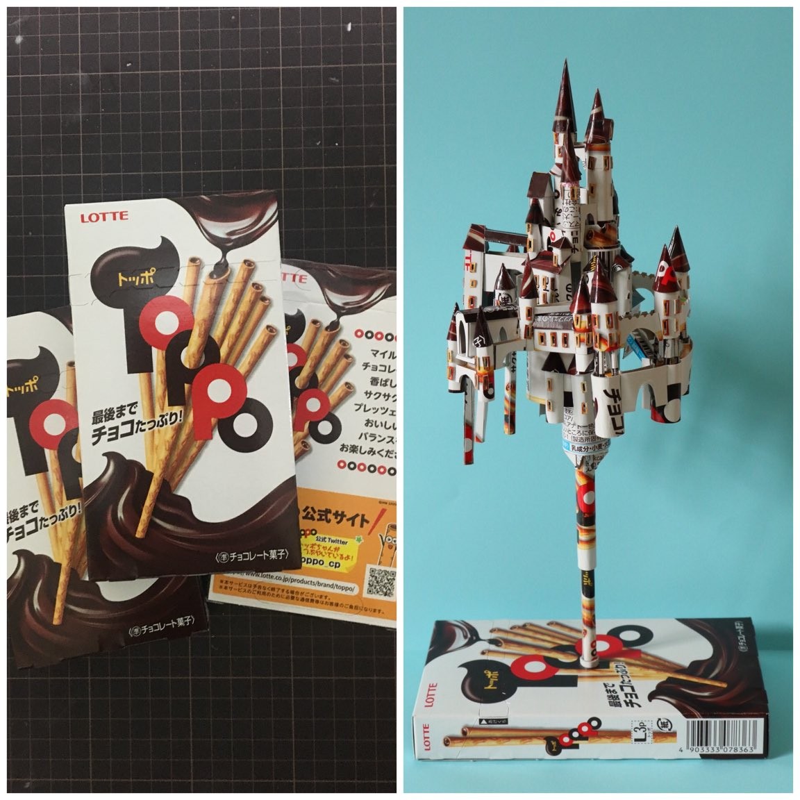 ▼「巧克力棒紙盒」改造成「城堡」,窗戶和屋頂都十分精緻。