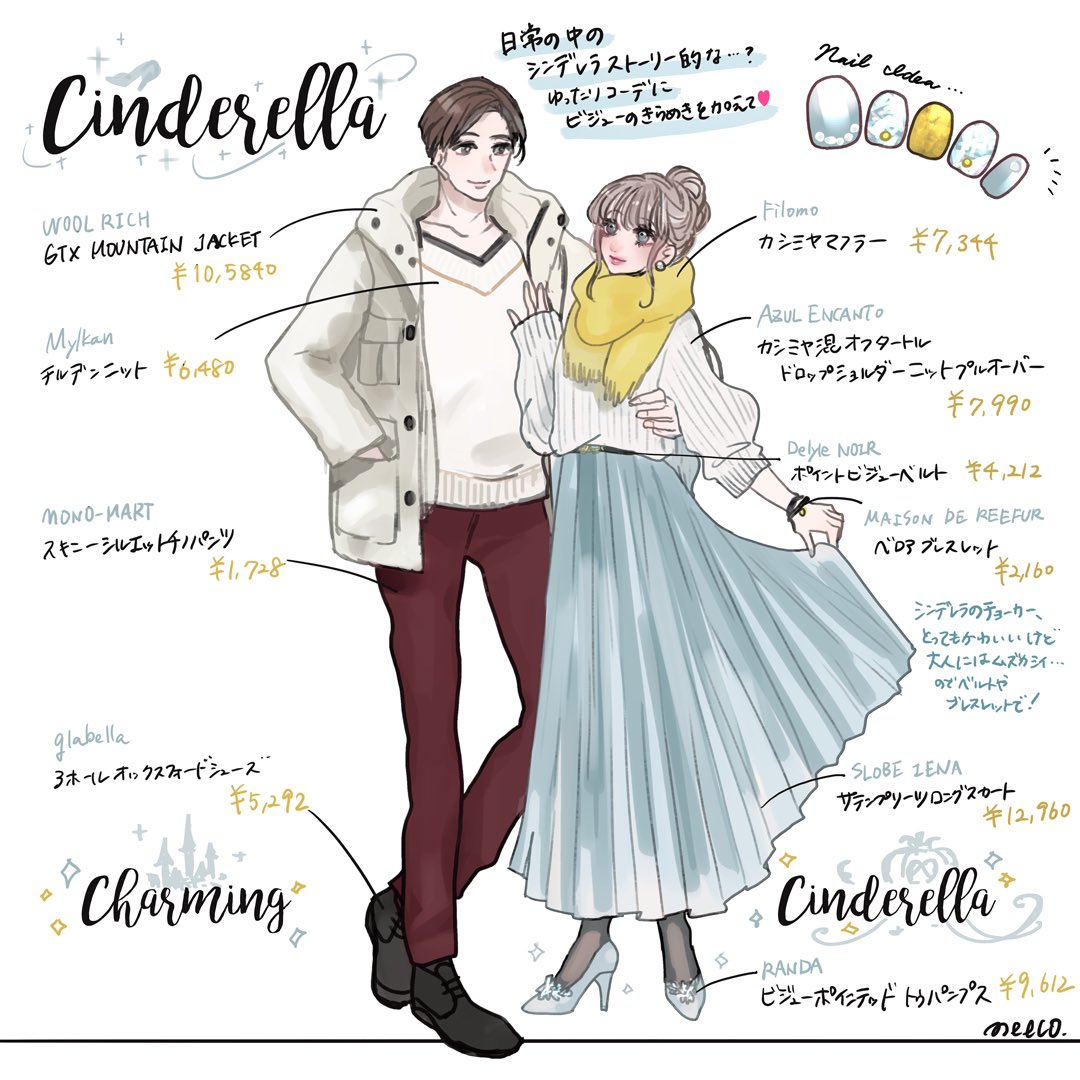 ▼白雪公主藍黃搭配的公主裙,在meecoみーこ的畫筆下,色系搭配更高級,配上深色大衣很優雅。王子同色系大衣和毛衣,看起來超有愛。