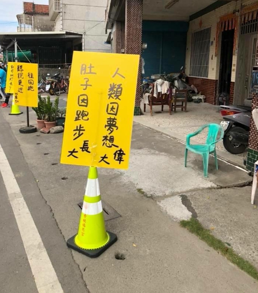 ▼第三屆「萬丹紅豆馬拉松」在12月24日舉行,而每年這場活動的最大亮點,就是主辦單位在半路上所放置的「應援舉牌」上,寫滿了各種充滿負能量的標語,包括「往回跑聽說更近」、「保持微笑,你是付錢來跑的」、「現在放棄,終點就到了」等字眼。