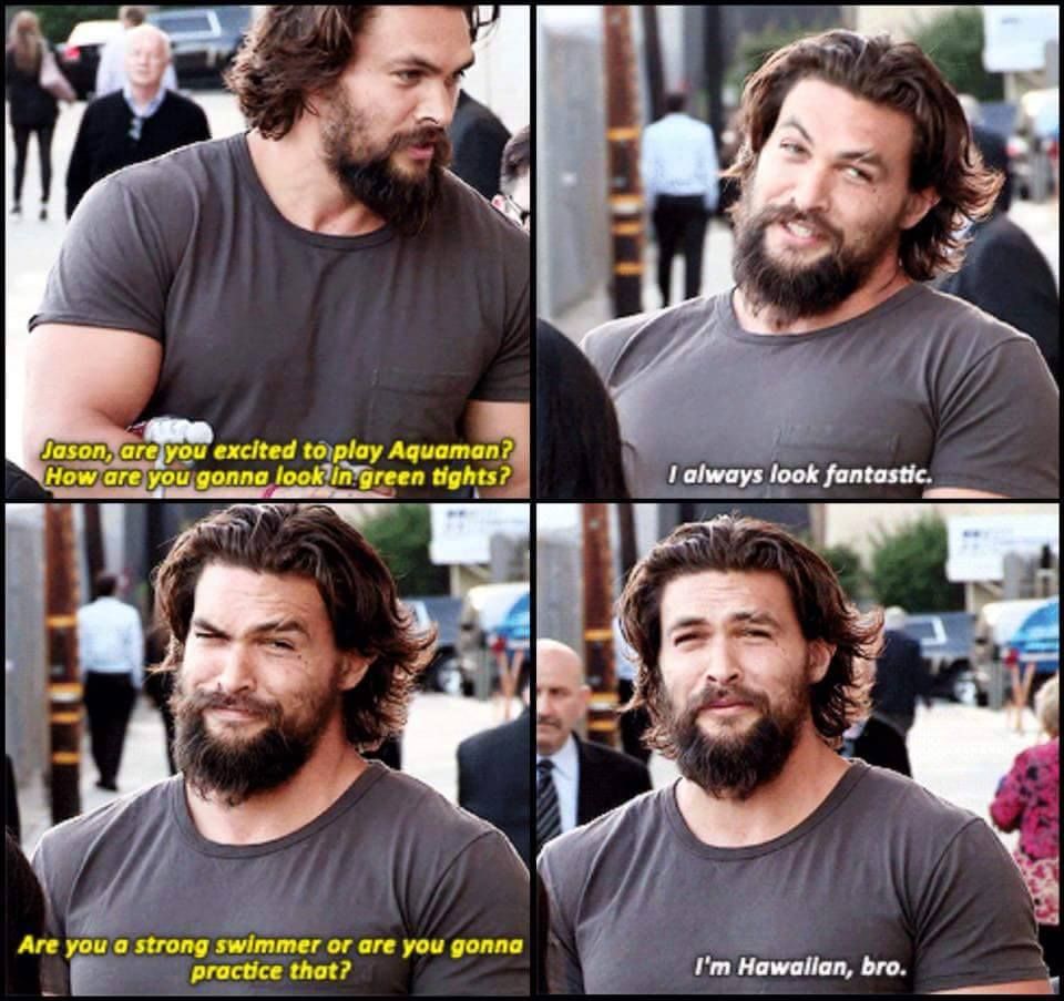 ▼1.跟狗仔抬槓:狗仔問他演水行俠開不開心,穿水行俠制服看起來怎麼樣,他調皮說「我一直很好看啊」。狗仔問他有沒有為這個角色練游泳,他則說「我是夏威夷人耶,兄弟」。