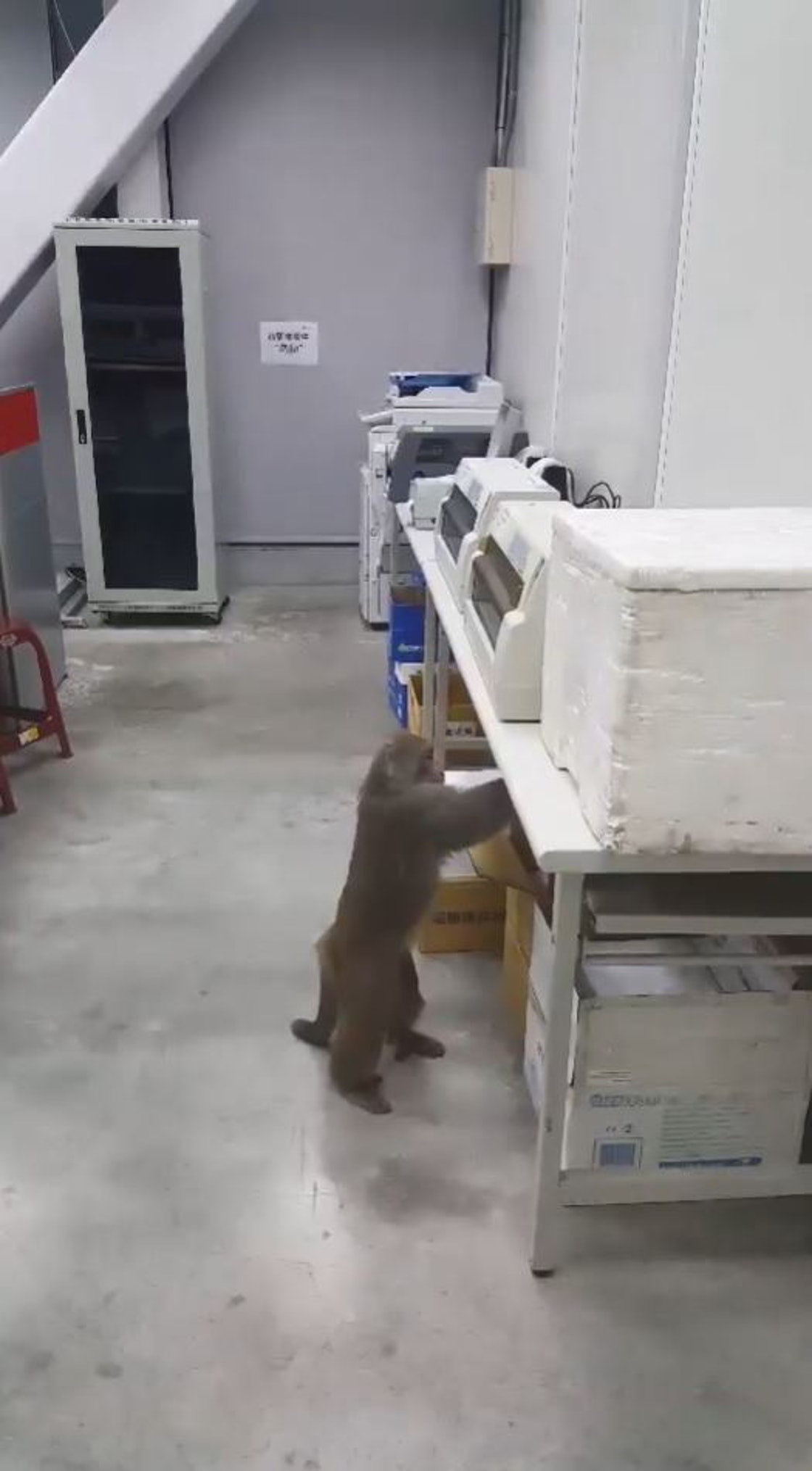 ▼機靈的小猴子還與玻璃外的拍攝者對望,眼神中毫無恐懼好像在說:「還不進來上班?」