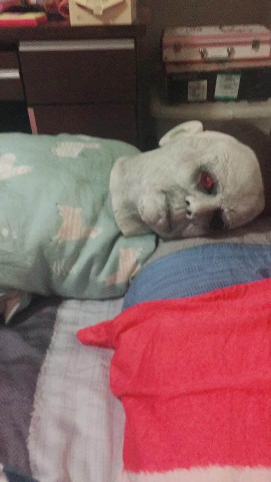 ▼結果原po早上起床時,一睜眼就與這個頭套「四目相接」,令她嚇得馬上睡意全消,還忍不住罵男友「世界上怎麼會有這種雞X人」。原來男友曾經戴著這個頭套叫她起床,沒想到如今就直接放在她的枕邊,令她幾乎快要崩潰了!