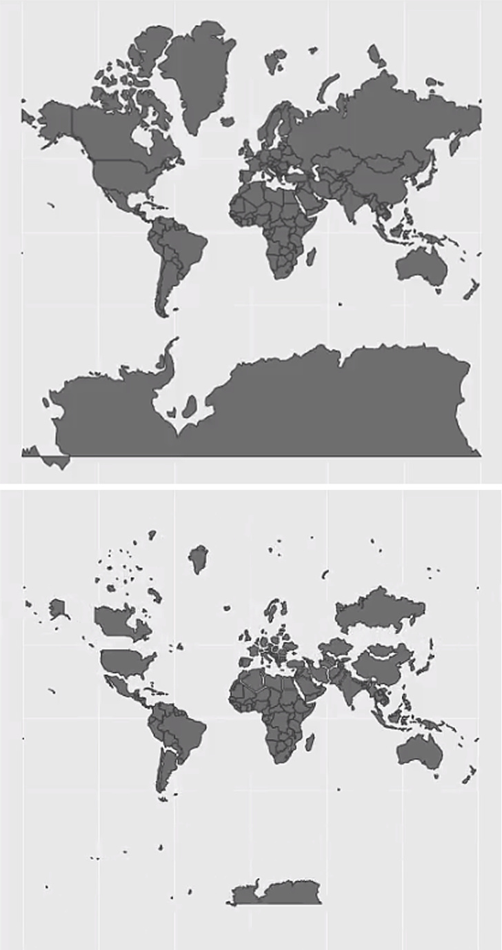 ▼麥卡托投影地圖 vs 陸地的真實尺寸。