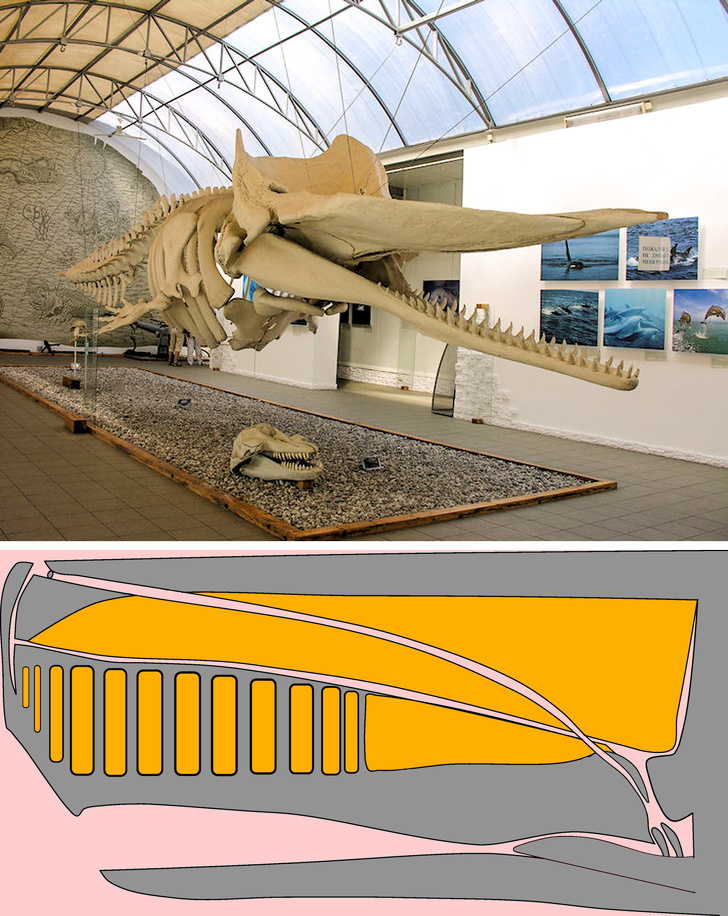 ▼抹香鯨的頭部有一個巨大的鯨蠟器官。抹香鯨下潛時,鯨蠟器官會變成固體狀;抹香鯨上浮時,鯨蠟器官會變成液體狀。