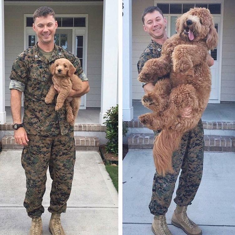 2019年01月02日正所謂「吾家有狗初長成」,不過這隻狗狗成長之速度相當驚人!美國一名長時間在外征戰的軍人,一年後再次返家卻發現愛犬已經幼犬變成體型大好幾倍的巨無霸成犬,軍人抱著它在同樣的地點拍照,景物依舊但人事已非,因為這隻狗狗實在變太大了!