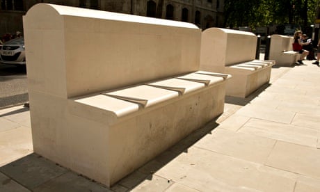 ▼倫敦:皇家法院外的長椅,沒辦法躺上去休息。