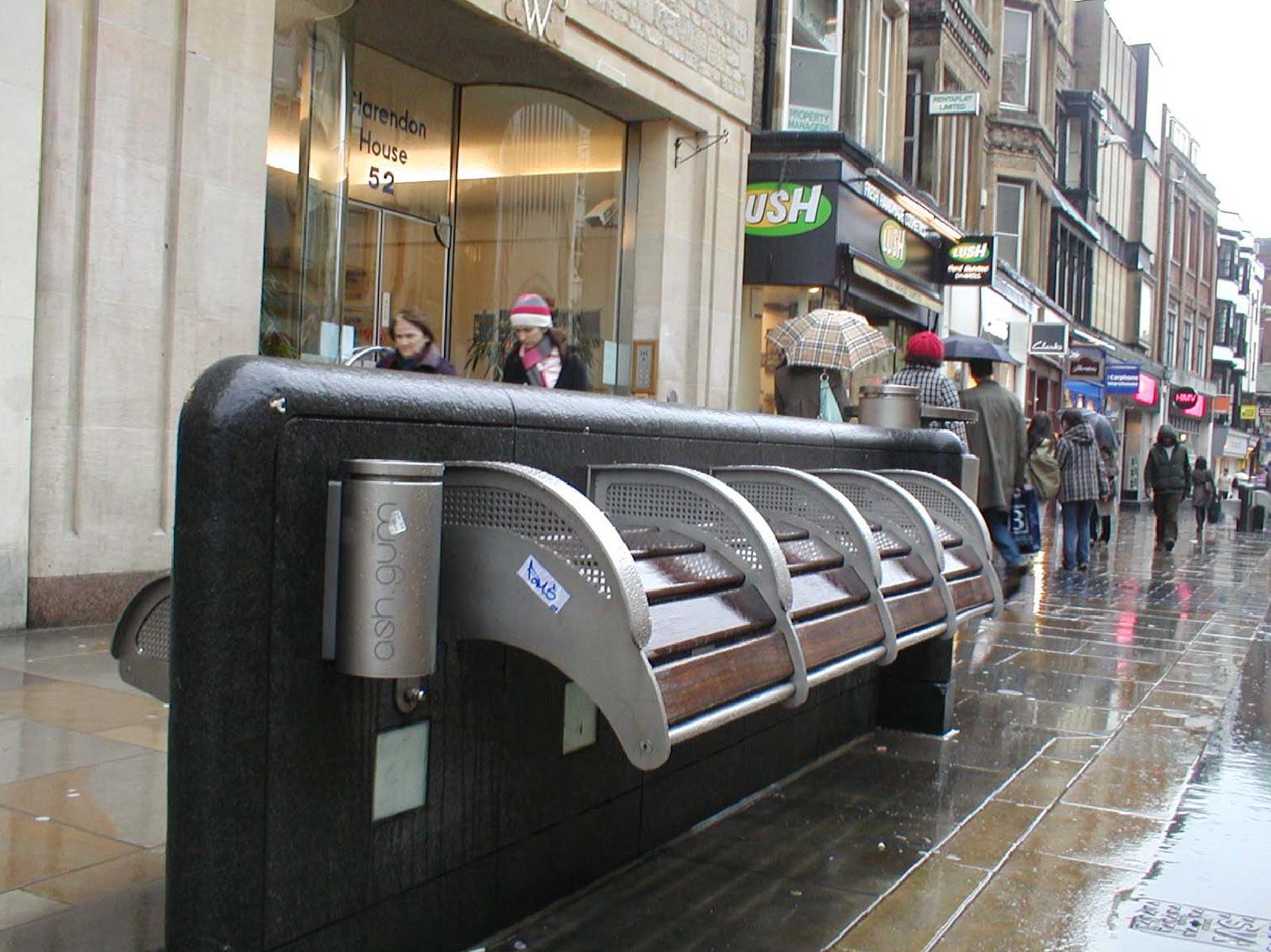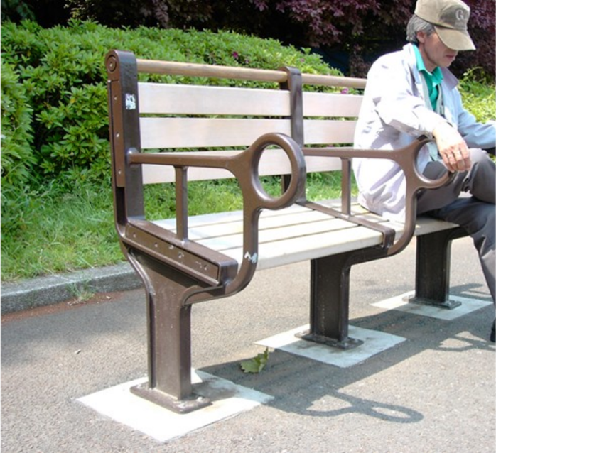 ▼日本東京:長椅中間裝上扶手,防止遊民躺在這裡睡覺。