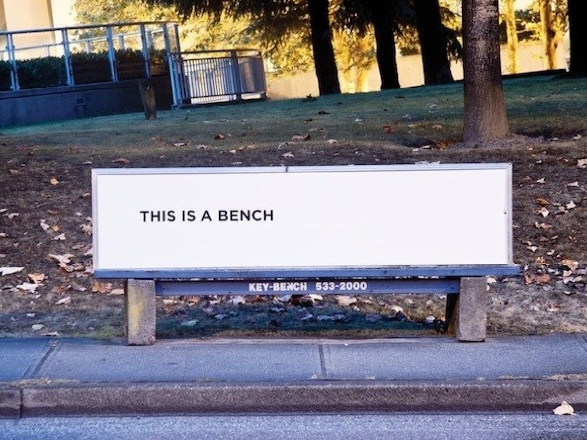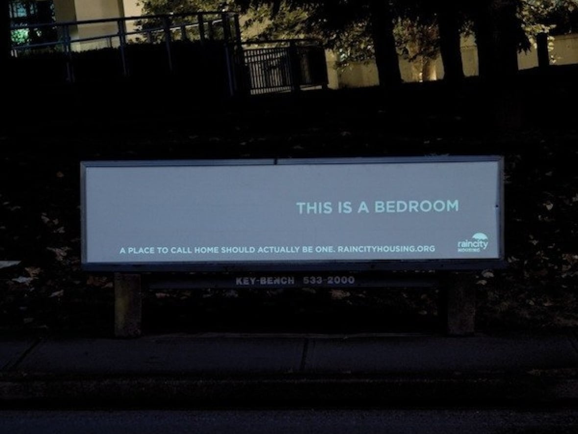 ▼白天椅背上寫著「這是長椅」;晚上還有螢光字「這是臥室」。