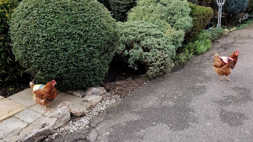 ▼Davina和Deidre每天過得美滋滋。牠們一隻穿著粉色反光背心,一隻穿著黃色反光背心,早上下完蛋後,大概會在7點左右出門,在外面轉悠8公里,晚上再回家吃晚飯、休息。David會給牠們準備食物,但牠們還是喜歡在外面找東西吃。