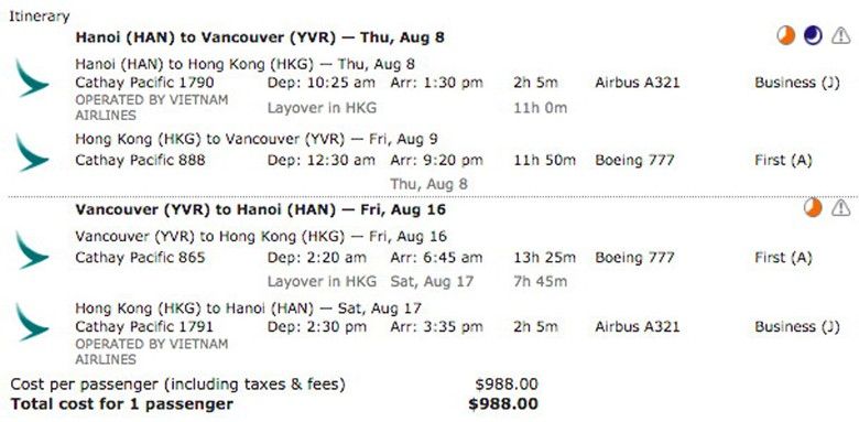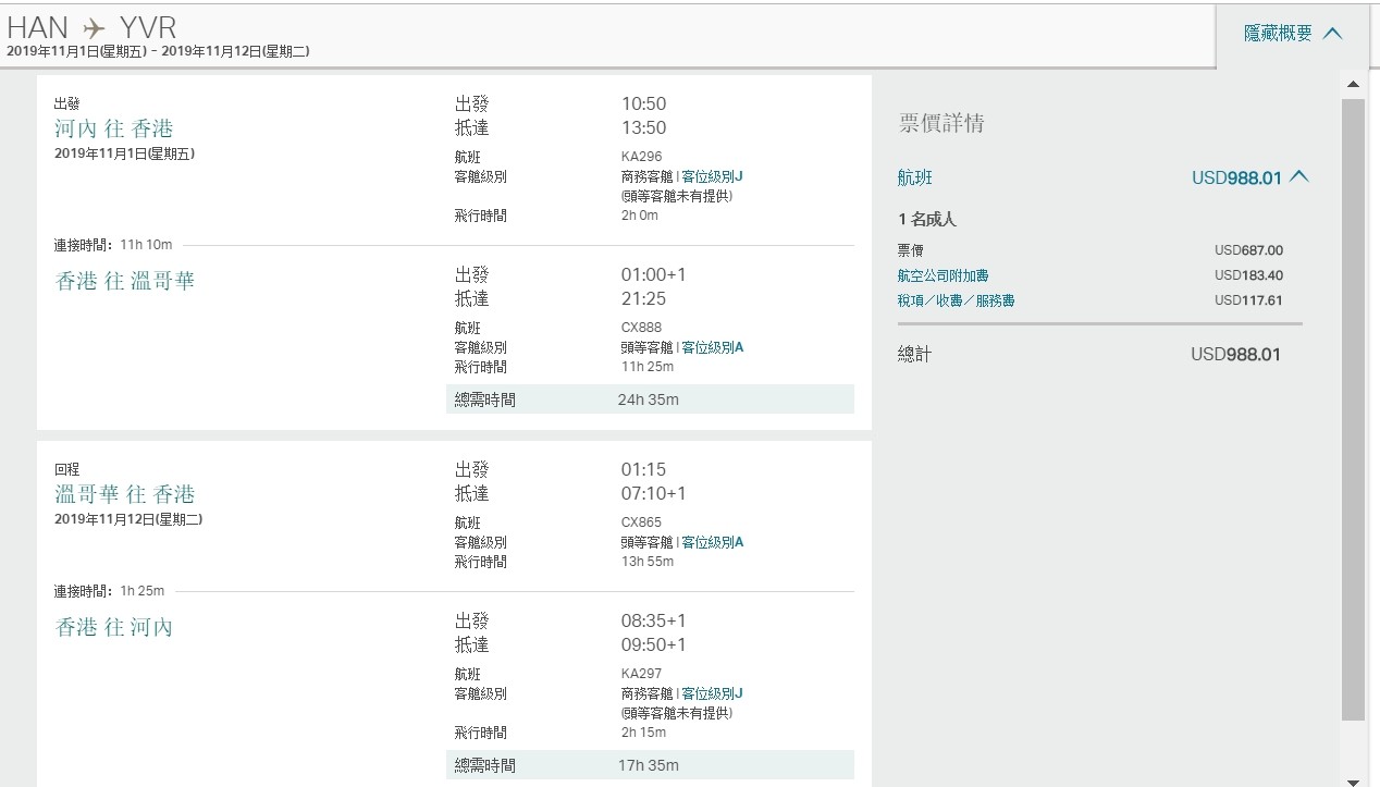 ▼外國網友和台灣網友都發現原價8月從越南河內前往加拿大溫哥華,來回頭等機票含稅居然只要988美元(約新台幣3萬元),最誇張的是,商務艙只標價675美元(約台幣2萬元)!