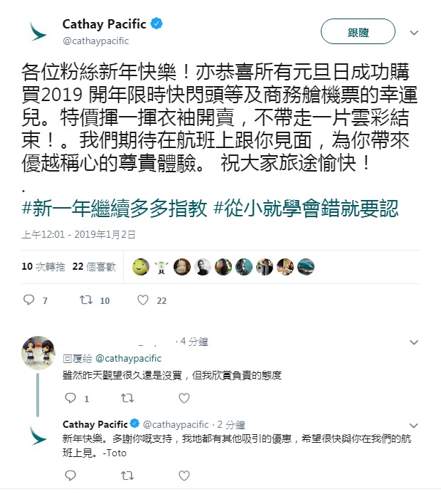 ▼他們居然在粉絲專頁上表示:「2019 開年限時頭等及商務艙機票 #揮一揮衣袖 開賣,#不帶走一片雲彩 結束!恭喜各位快閃參加者。我們期待在航班上跟你見面,為你帶來優越稱心的尊貴體驗。祝大家旅途愉快!」「#新一年繼續多多指教 #從小就學會錯就要認」。