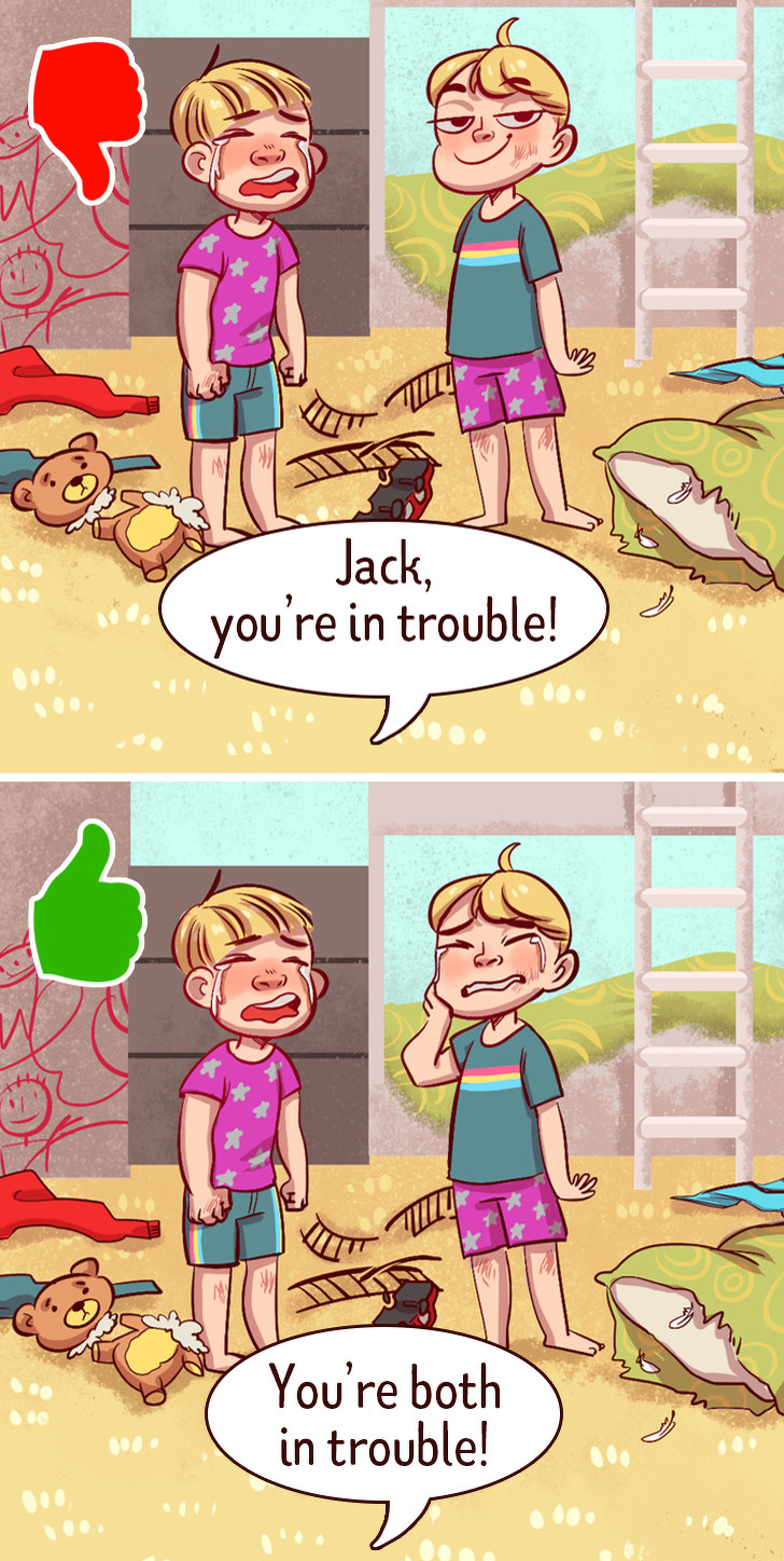 如果只處罰自己認為有錯的孩子,將會讓他覺得你是在針對他,這是非常不健康的教育方式。另一個孩子也會僥倖到以為自己能一直逃過處罰,成人後也會變得輕傲。