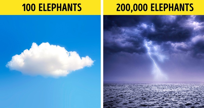 ▼18)一片雲大約有500噸重,相當於100頭大象;而風暴雲的重量則約有相當於20萬頭大象!