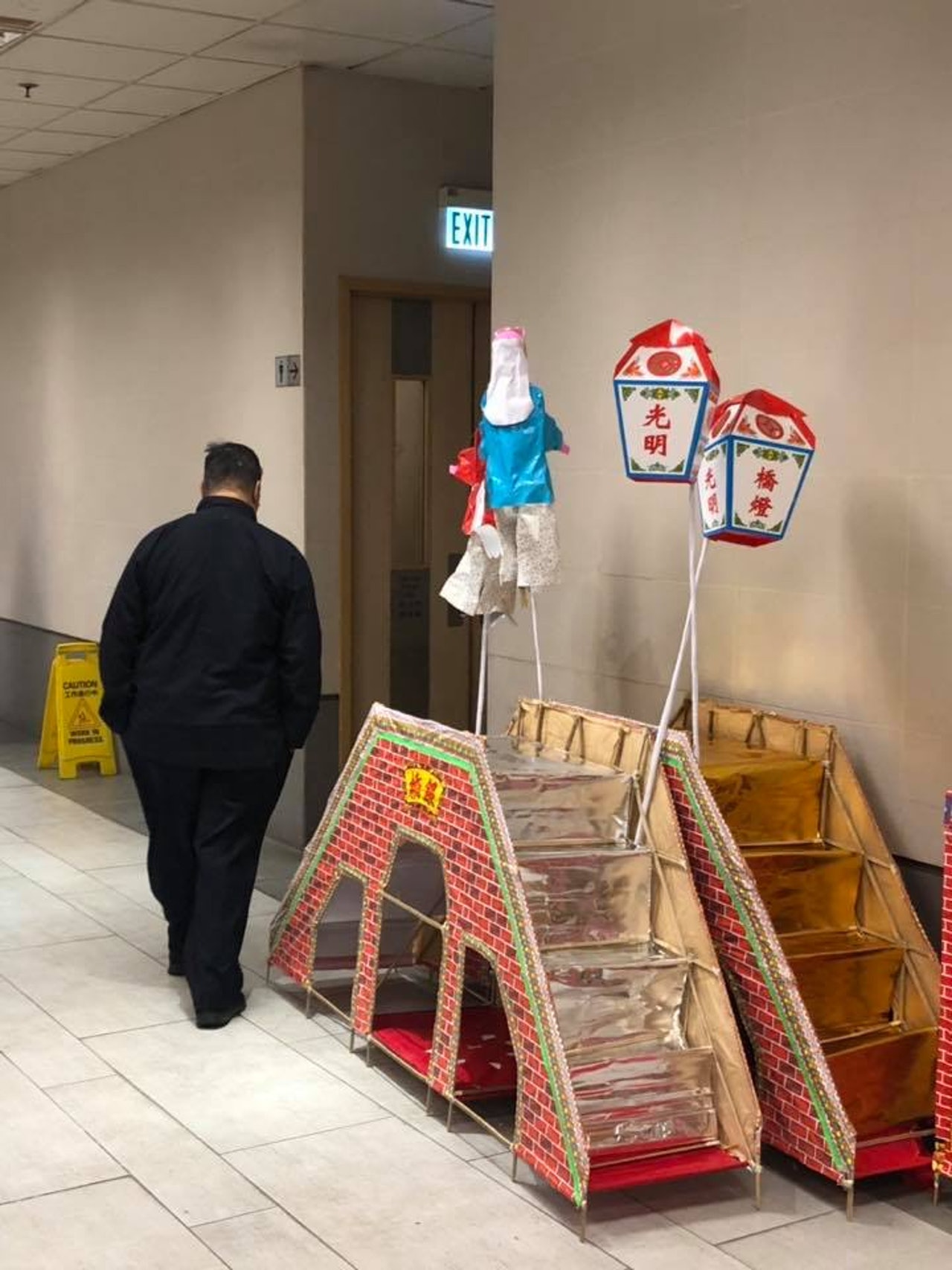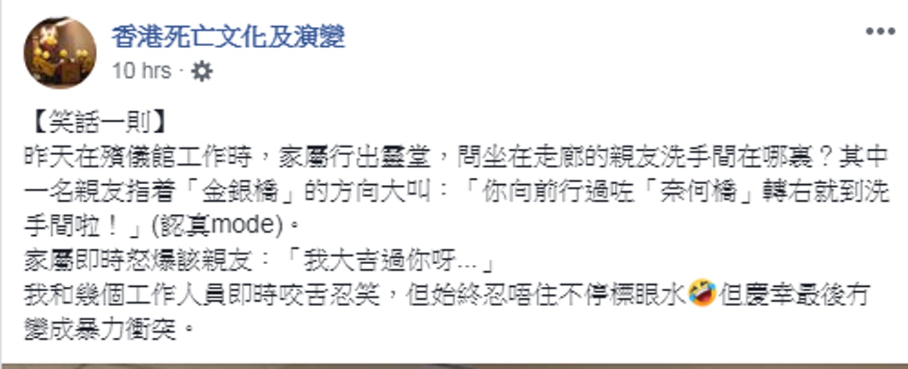 ▼這名網友在社群網站分享了那件趣事。1月3日,他在殯儀館工作時,遇到了一名走出靈堂的家屬。那名家屬問旁邊的親友,洗手間在哪裡。一名親友指著前方一個紙紮品「金銀橋」說:「你向前走過奈何橋,右轉就到洗手間啦!」