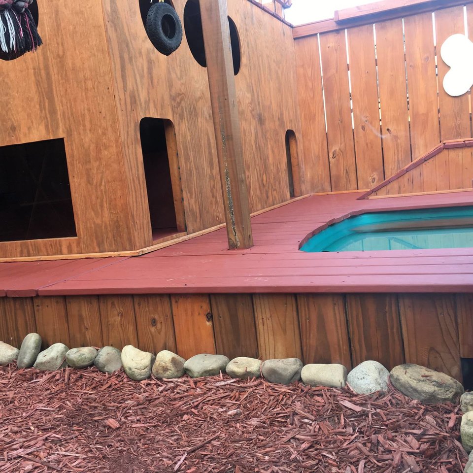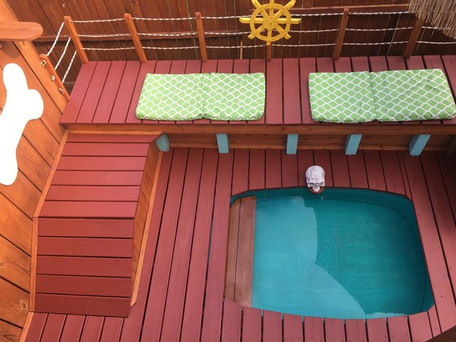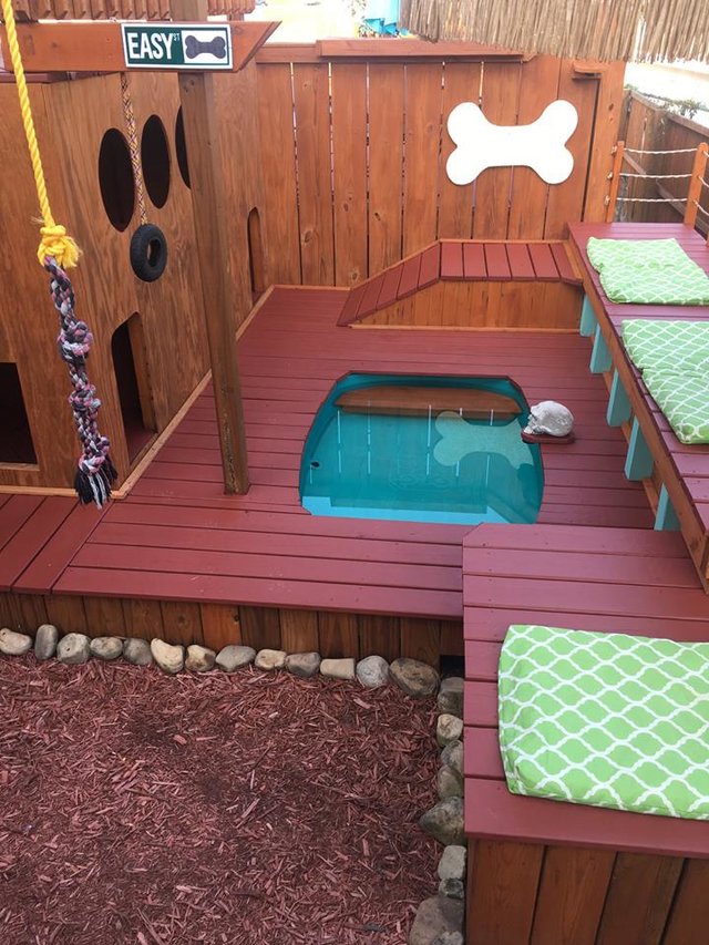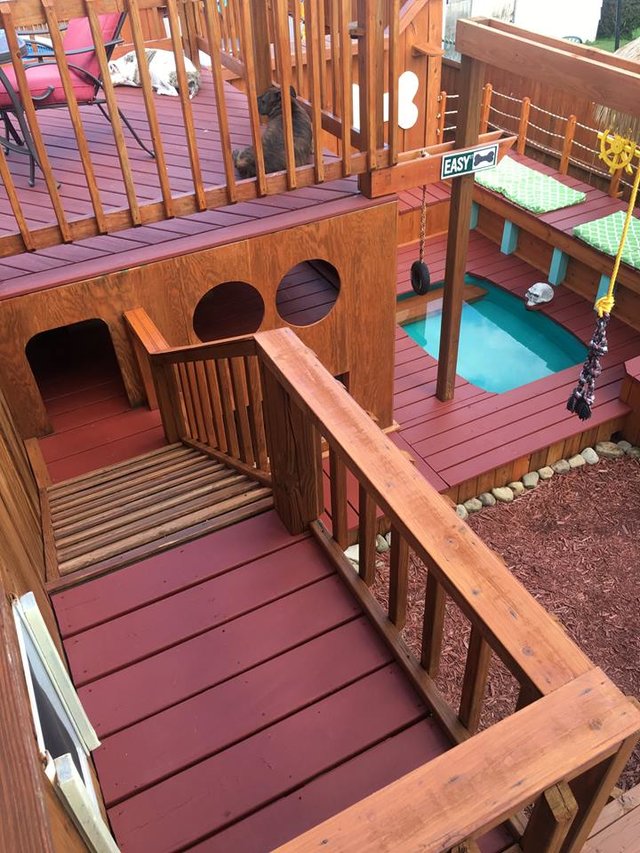 ▼這棟狗狗豪宅一共有3層,最上面是Aaron家的地板,狗狗們可以通過一個斜坡進入第二層,不管是躺在那裡休息還是把頭伸出窗戶看風景,都很舒服。後面是通往最底層的樓梯,游泳池就在那裡。