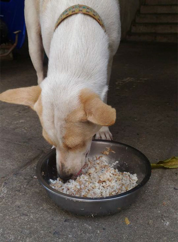 ▼大概覺得吃到美味的飯飯應該報答一下,小白狗每次吃飯都會帶來一些小禮物,交給Orawan後才開動。