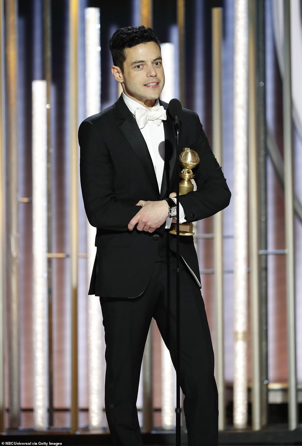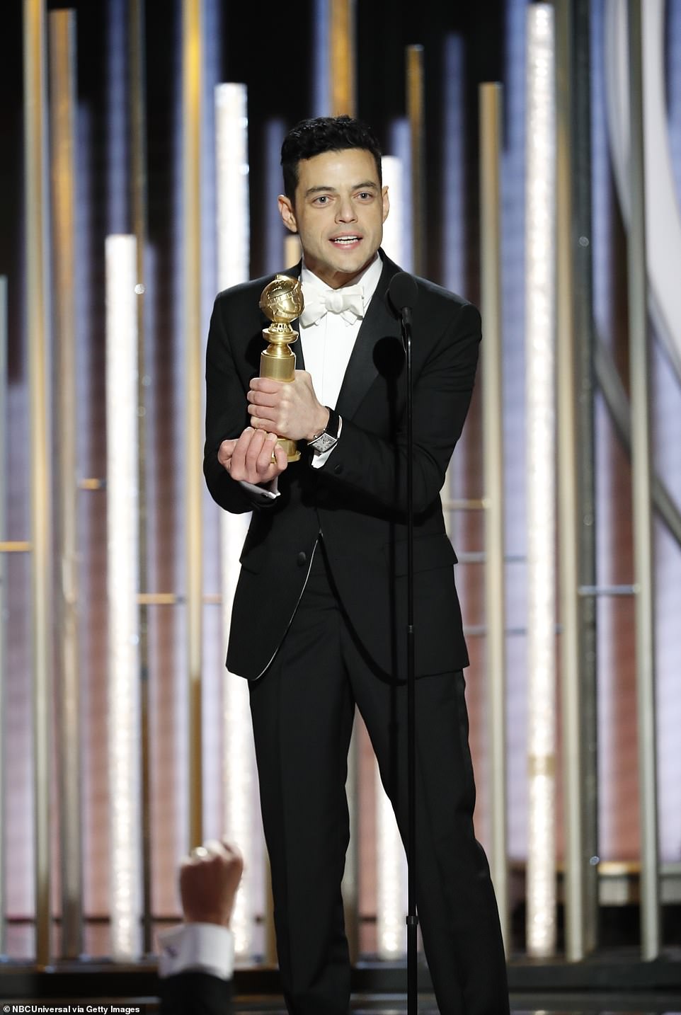 ▼雷米馬利克拿下金球影帝後,將獎杯緊緊抱在懷裡,還感謝了「皇后合唱團」的主唱佛萊迪墨裘瑞(Freddie Mercury)。