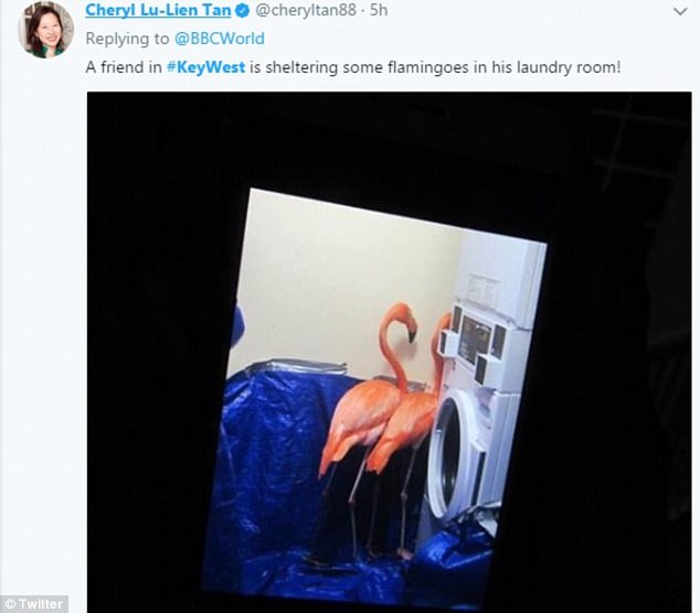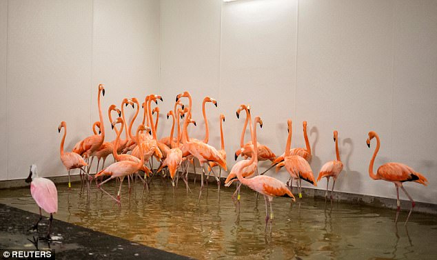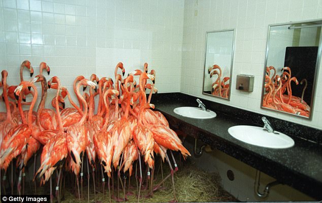 ▼火烈鳥們正在浴室躲避颶風,在這裡牠們不用擔心風吹雨淋。
