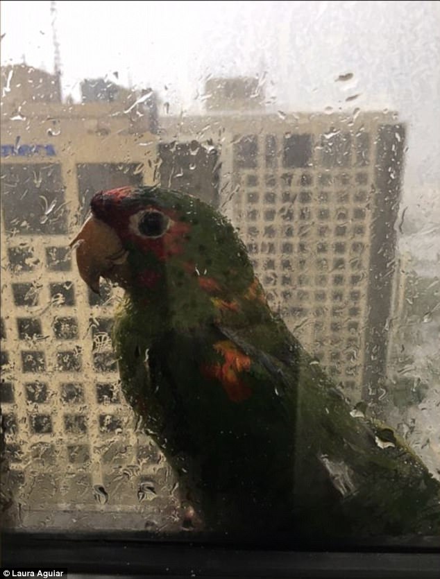 ▼這一家人住在邁阿密萬豪飯店的22樓,兩隻鸚鵡正站在窗邊躲避颶風。