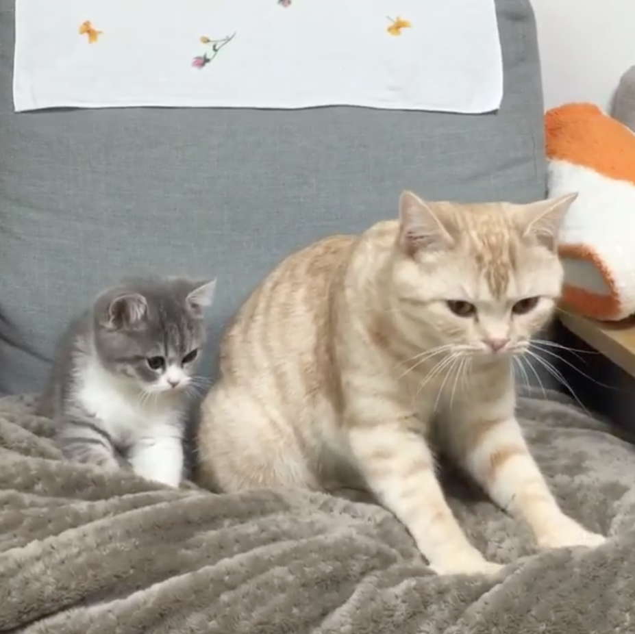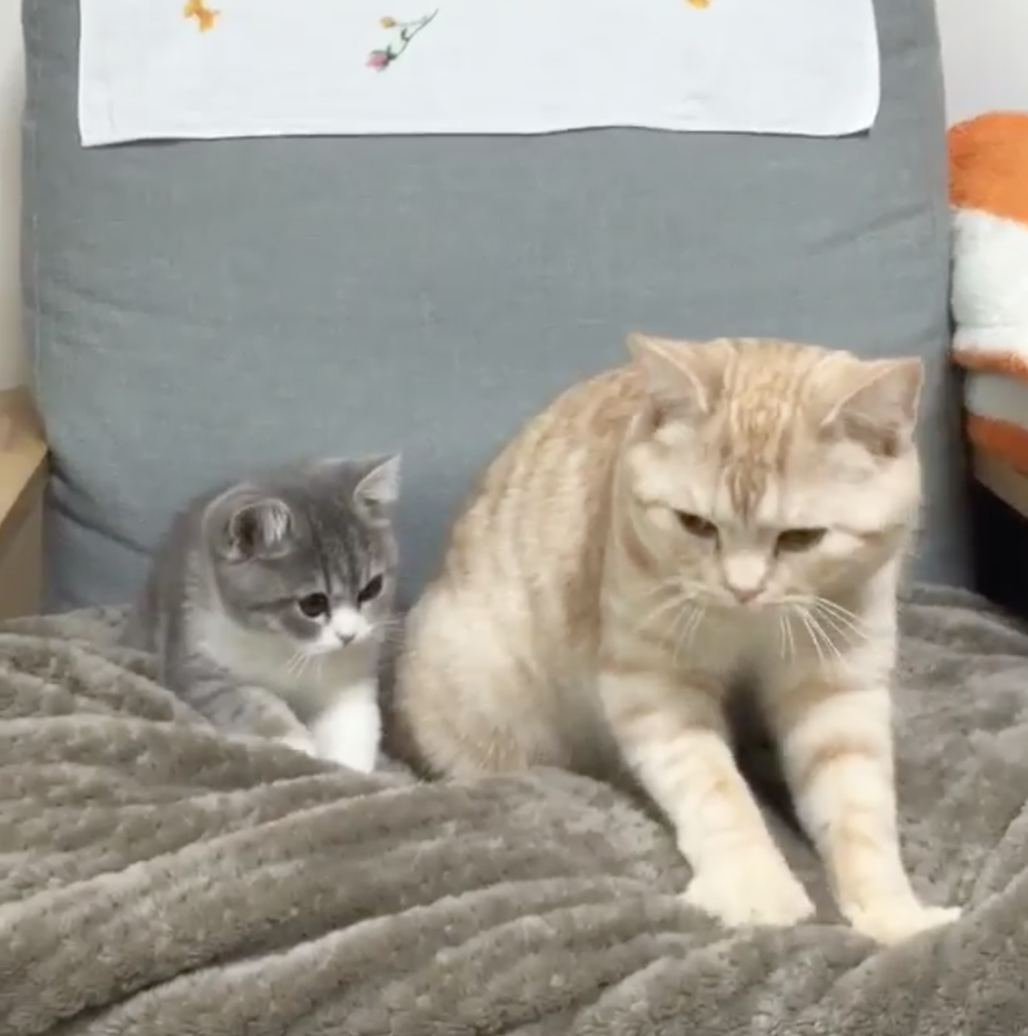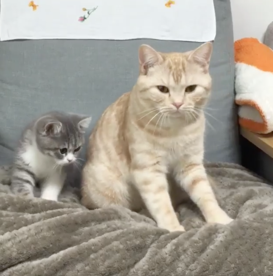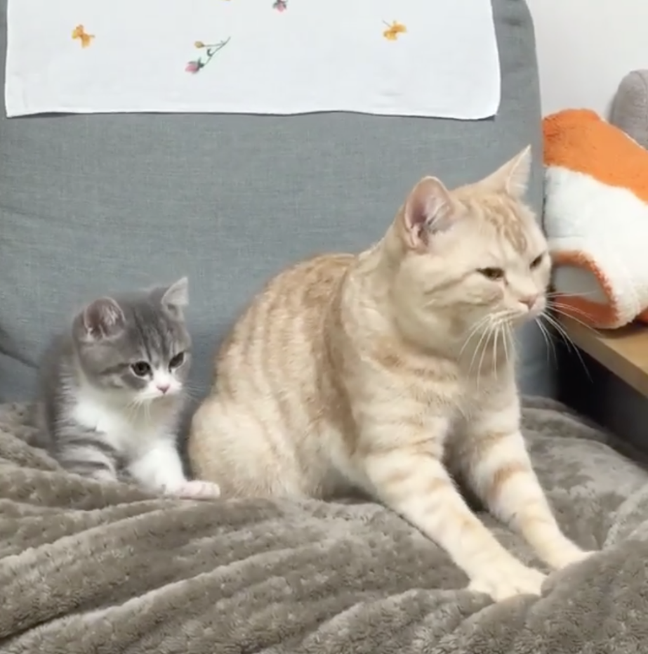 ▼一旁的小喵喵就跟著牠的動作做一次,簡直是一個乖學生!