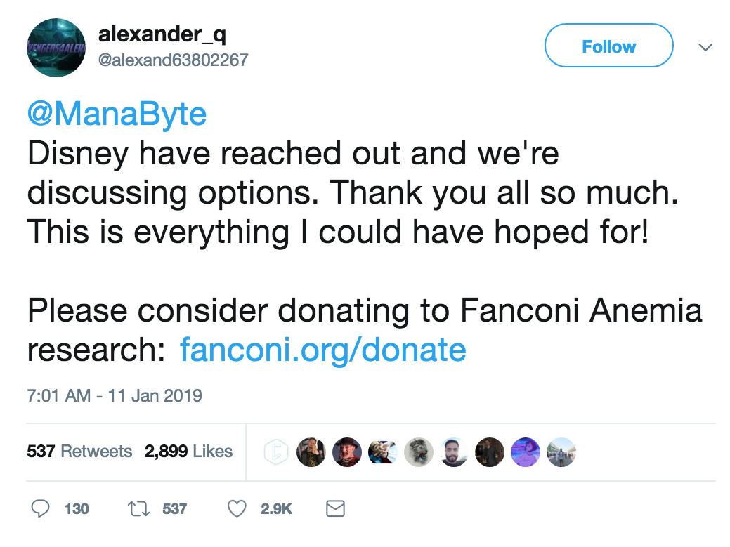 ▼1月11日,亞歷山大在推特和 Reddit 上po文告知了大家這個好消息,也表示如今迪士尼正在於他討論,要用什麼方式幫助他實現願望。對於想要捐款給他的民眾,亞歷山大表示可以將錢捐到「范可尼氏貧血研究基金會」(Fanconi Anemia Research Fund),幫助更多因此而受苦的人。