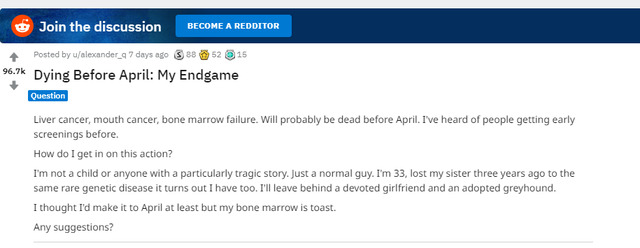 ▼他在 Reddit 中所po的文章中表示,自己自幼就是漫威的粉絲,也從來沒有錯過任何一部漫威電影,非常希望自己能夠看到《復仇者聯盟4》的上映,希望網友能夠給他一些意見,因為這部電影是「之前所有事情的高潮,一個章節的結束」,無論如何都不能錯過。