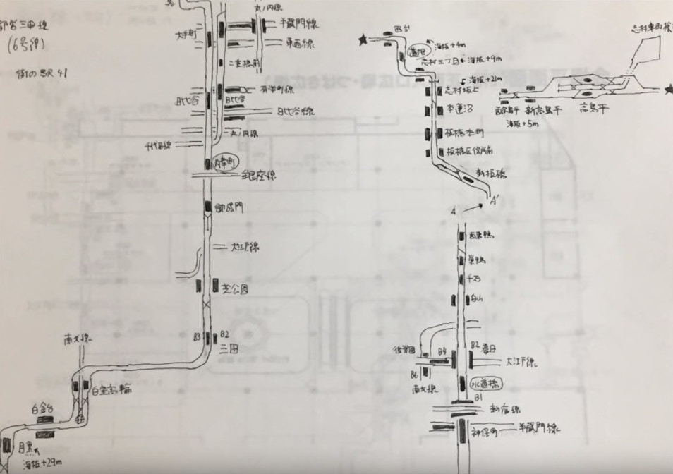 ▼由於東京地鐵的複雜度實在太過於複雜,因此提出這個建議的日本YouTuber 松岡純正在開始召集同好之前,也閱讀了許多關於東京地鐵的線路圖、站與站之間的關係圖、各線路及車站位置高低的地理圖等,再為每條線整理和畫出了超詳細的平面圖,為實做時做好了一切萬全的準備。