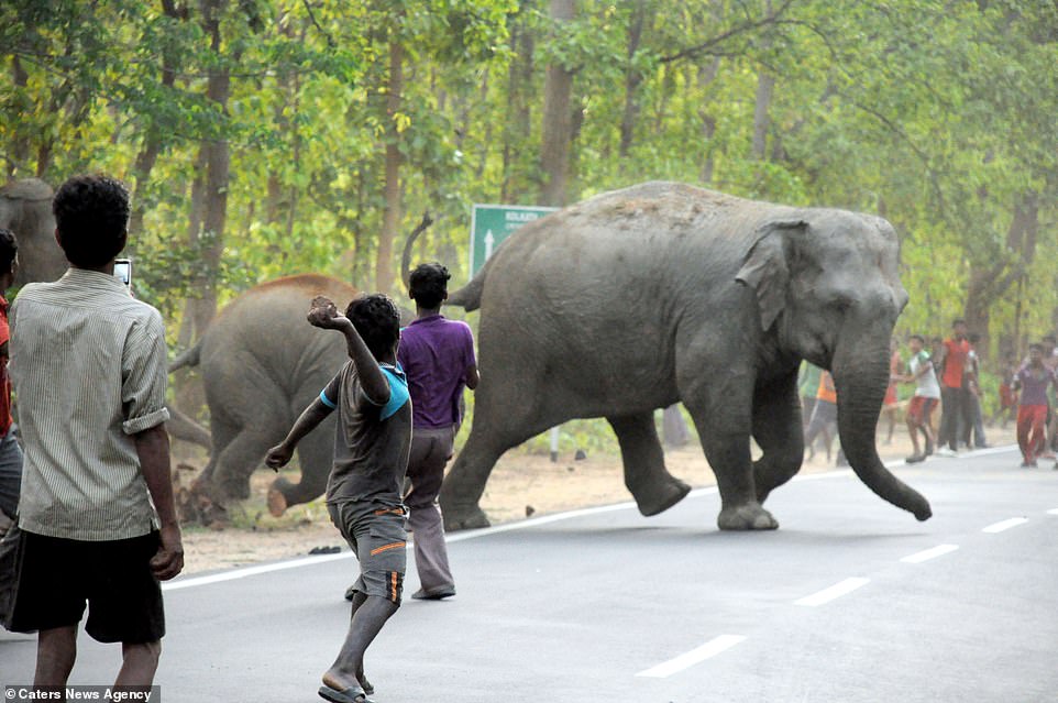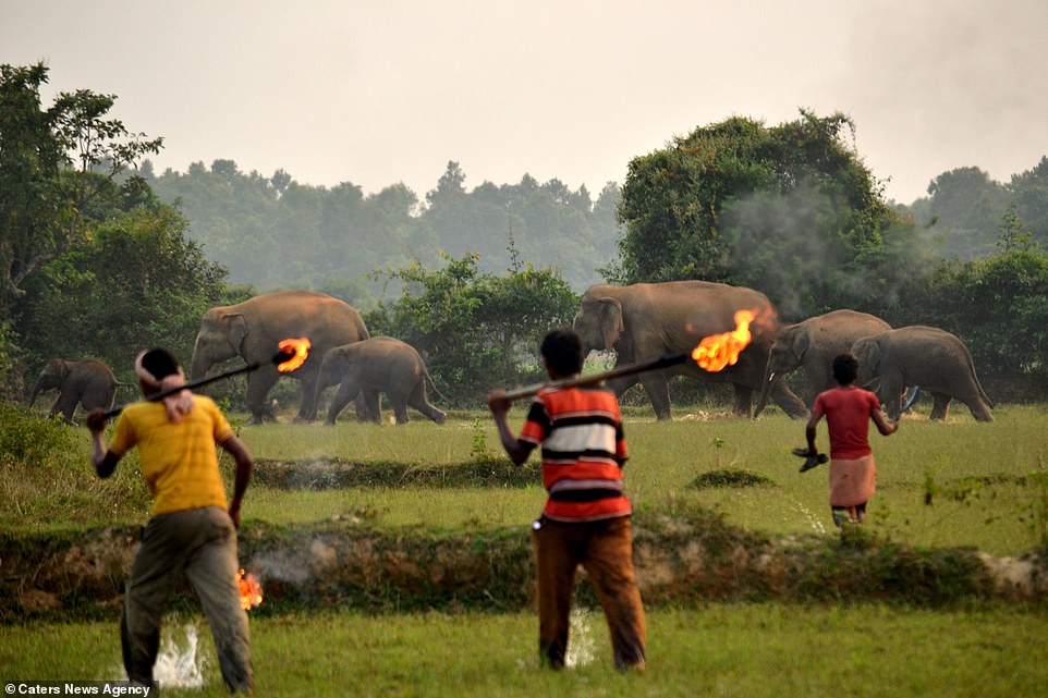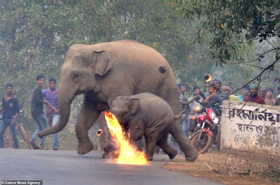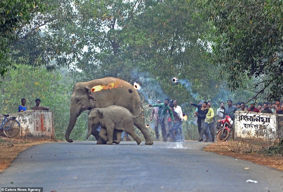 ▼從以下的照片可以看到,一群印度村民正在對大象母子投擲汽油彈以驅趕牠們。