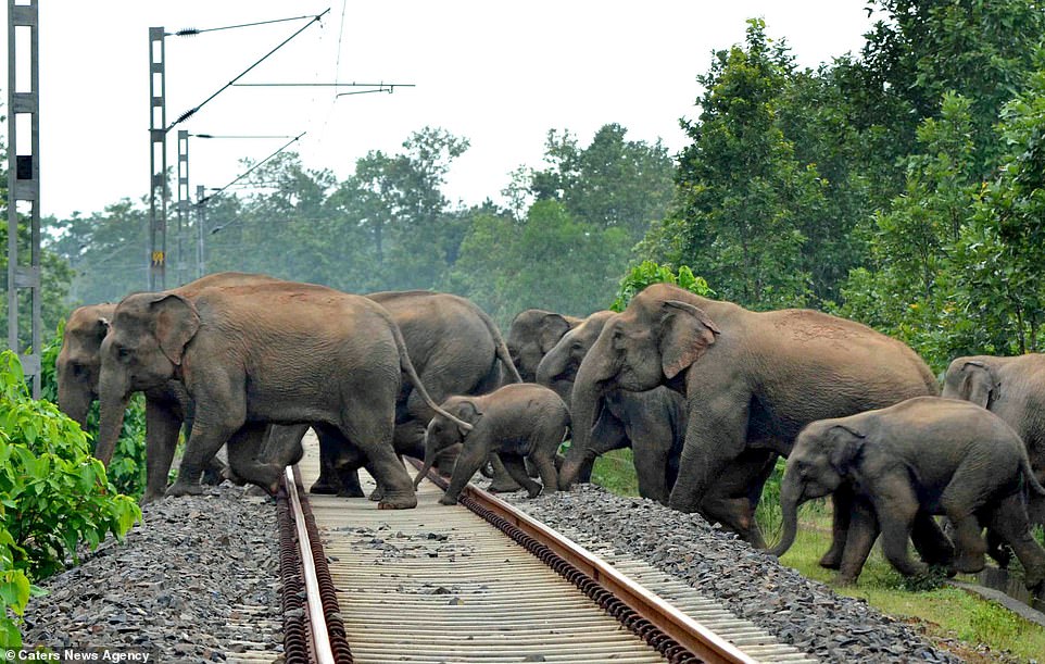 ▼由於棲地受到危害,大象媽媽還得小心翼翼地帶著小象,穿越人類砍伐森林所建造的鐵軌。
