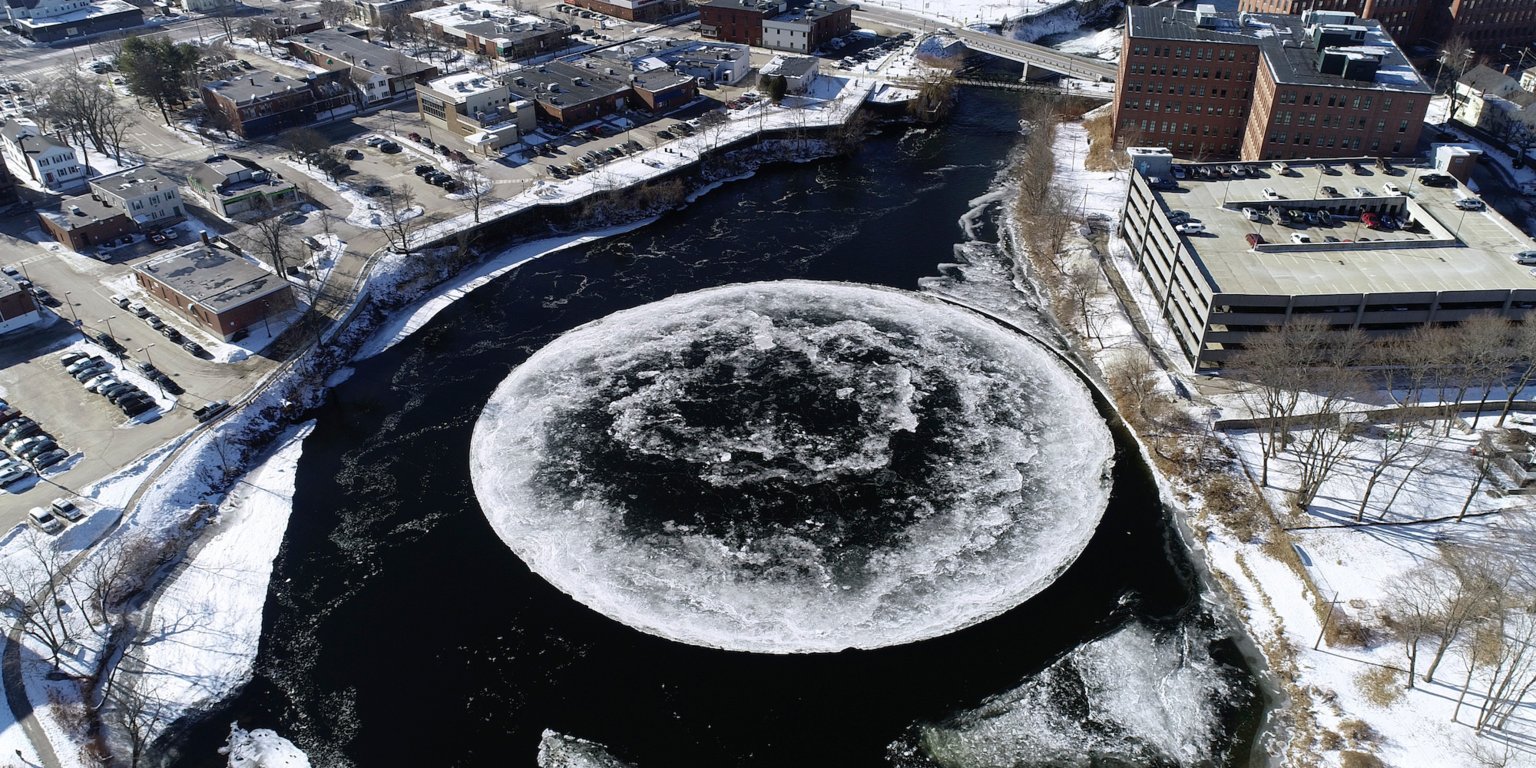 ▼冰盤位於韋斯保克市的普利桑普斯科特河(Presumpscot River)河面,直徑約91米。美麗的花紋更增添了逼真度,從空中俯瞰就猶如漂浮在銀河中的月球一般,更神奇的是,冰盤還隨著水流不斷旋轉,有網友開玩笑說,是外星人的飛碟降落在了河面上。