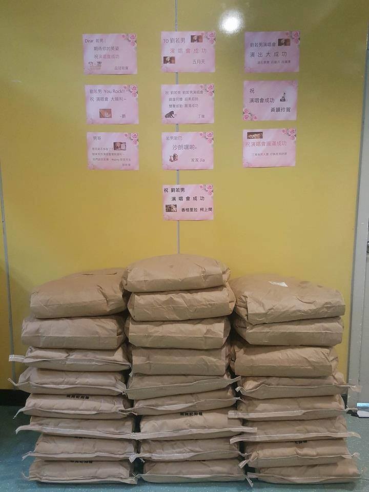 ▼這些祝福的飼料都堆在後台,重達810公斤!上面則貼上一張紙條,祝福演唱會成功。