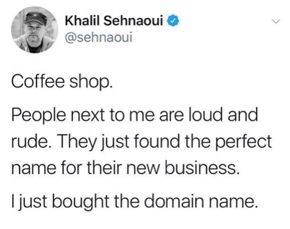 ▼「我想安靜喝一杯咖啡,但隔壁的人太吵了。他們說想出了新創業公司的名字,然後我就把那個名字的商標買下來了。」