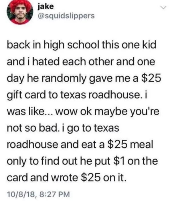 ▼「高中時我和一個同學相看兩相厭,有一天他突然給了我一張25元的餐廳消費卡。我就想『其實他也沒有那麼壞嘛』,後來我去那間餐廳吃飯,點了25元的餐點,吃完之後才發現那張消費卡裡面只有1元,他只是寫了25元。」