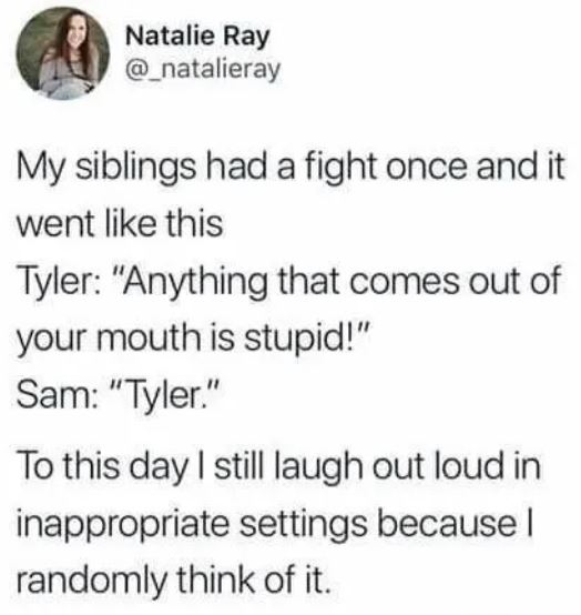 ▼「我的弟弟,泰勒和山姆,有一次大吵了一架,泰勒罵山姆:『你說出來的東西都很笨!』山姆就說:『泰勒!』」