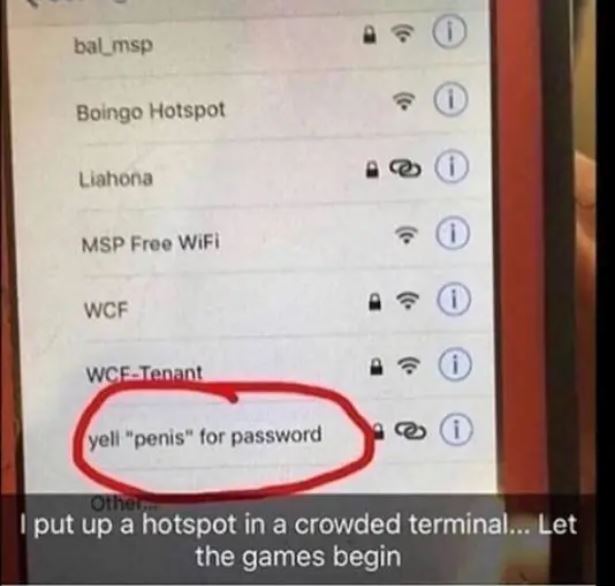 ▼「我在人潮洶湧的地方打開手機熱點,然後取了這個名字:大叫『雞雞』我就給你密碼~」