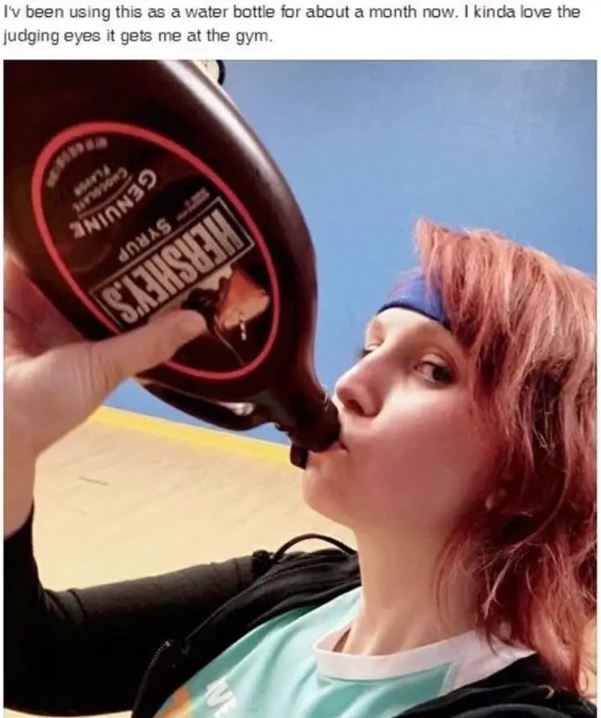 ▼「我用裝巧克力醬的瓶子當水壺,在健身房運動完拿出來喝水時別人看我的眼光怪怪的。」